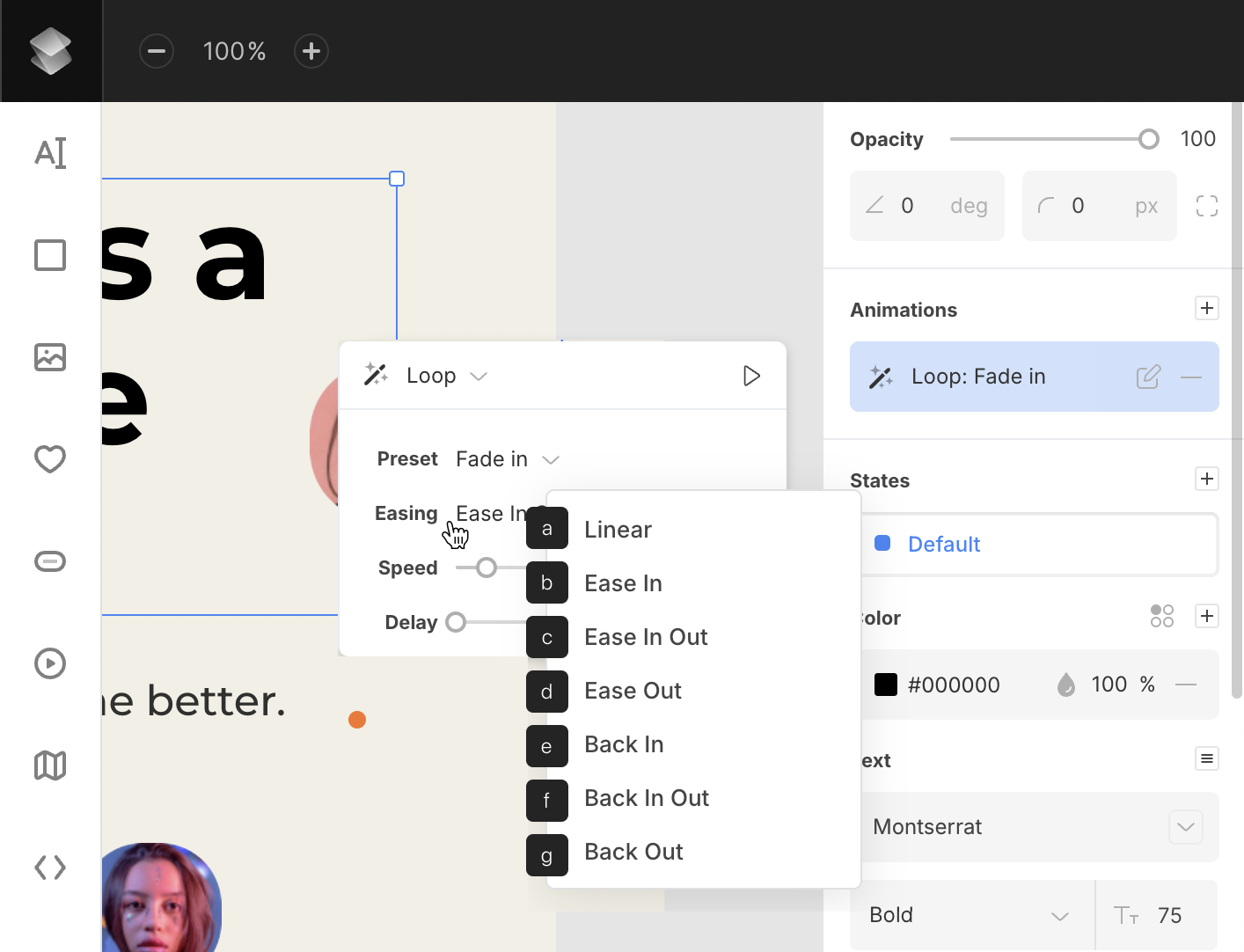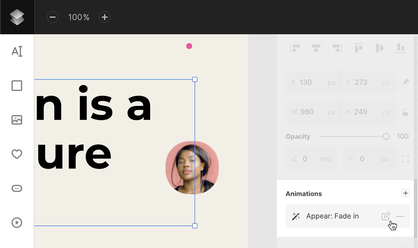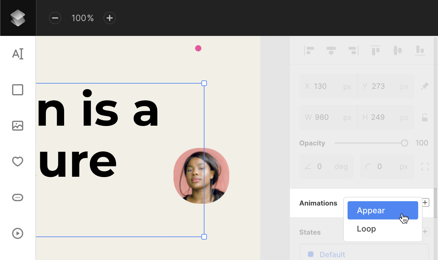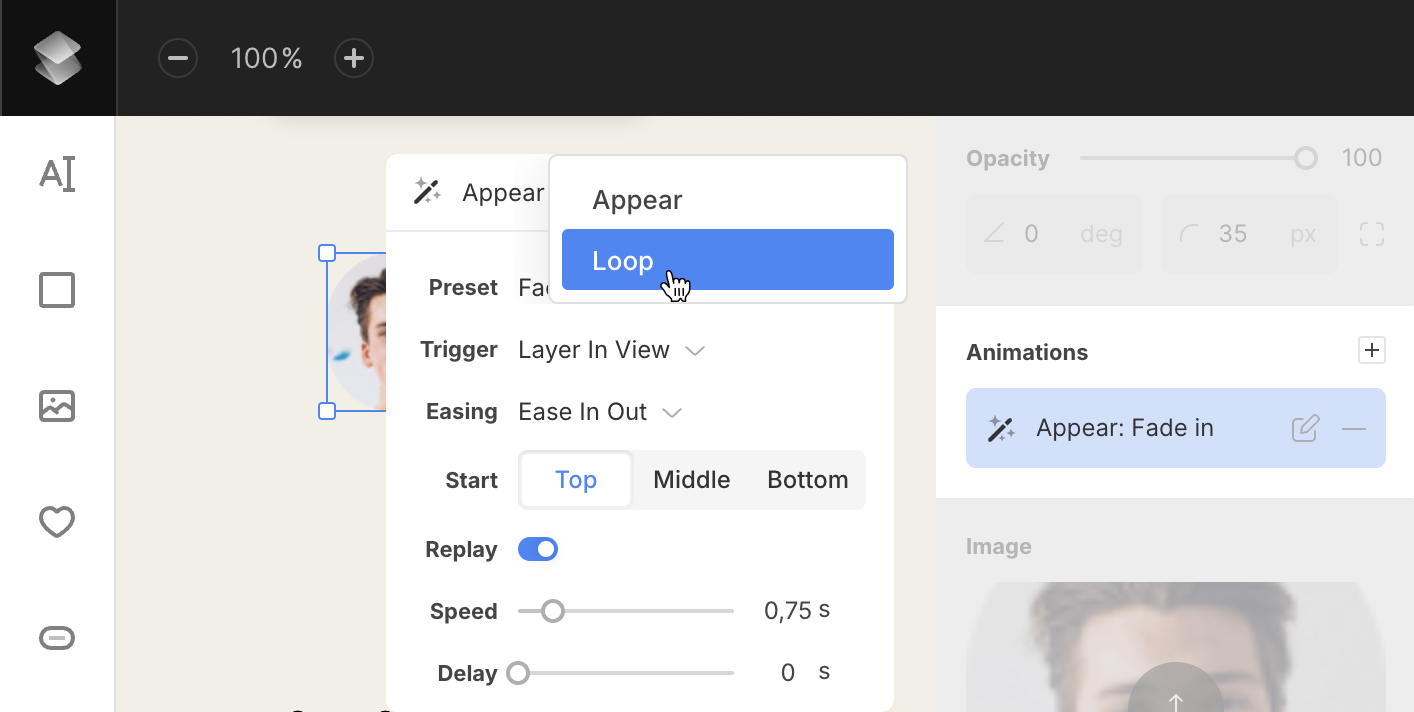 Once Animation is added, the selected object will instantly have a default effect applied (either Appear: Fade In or Loop: Fade In).