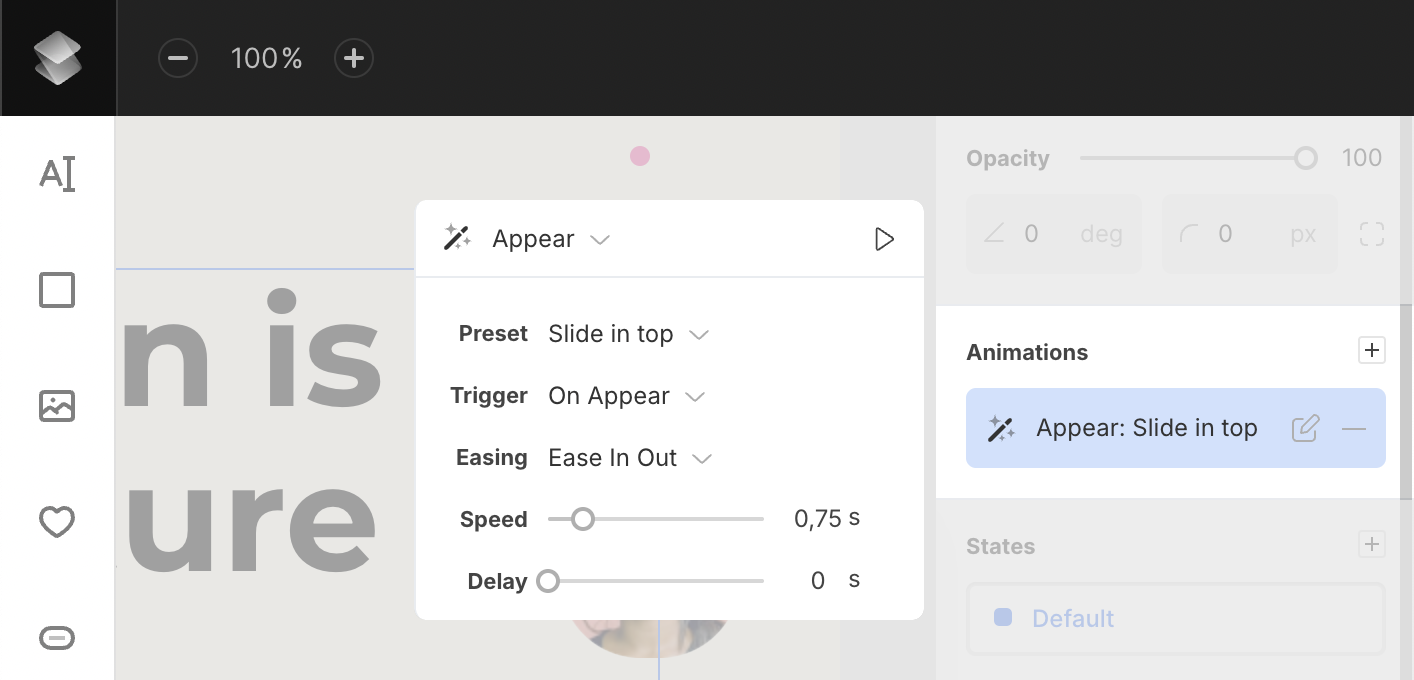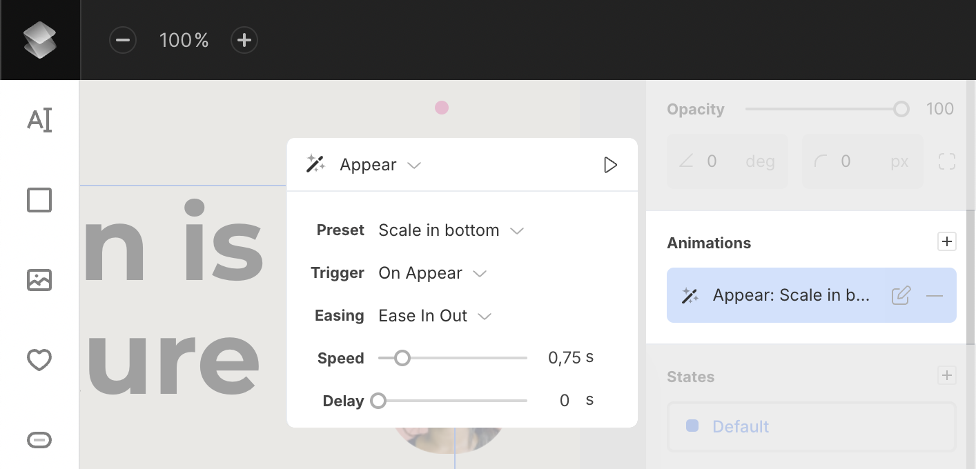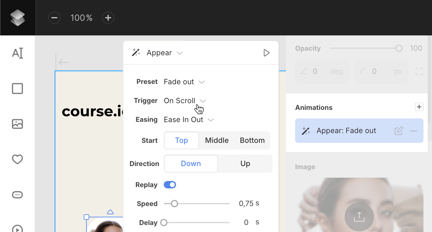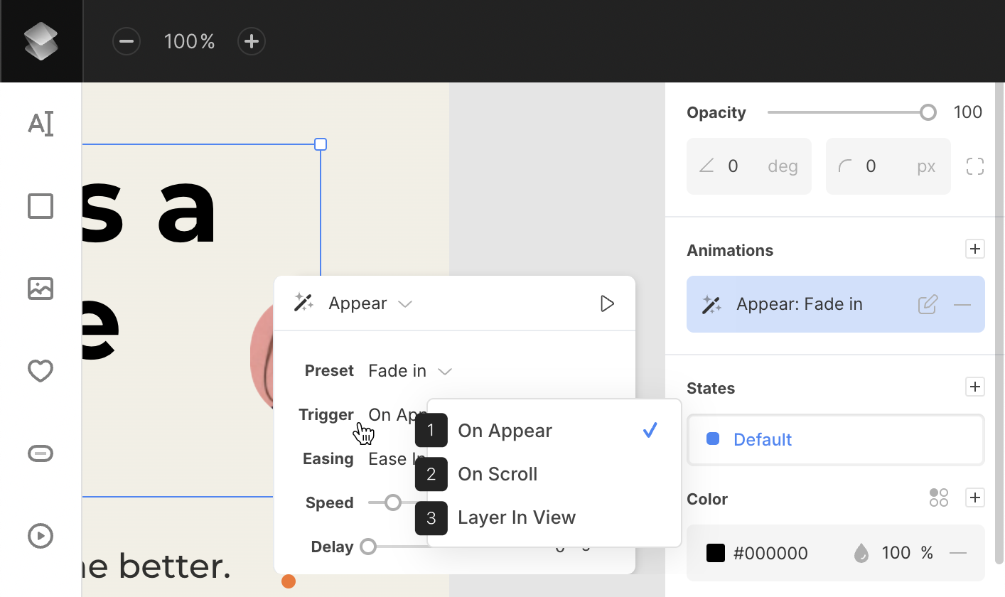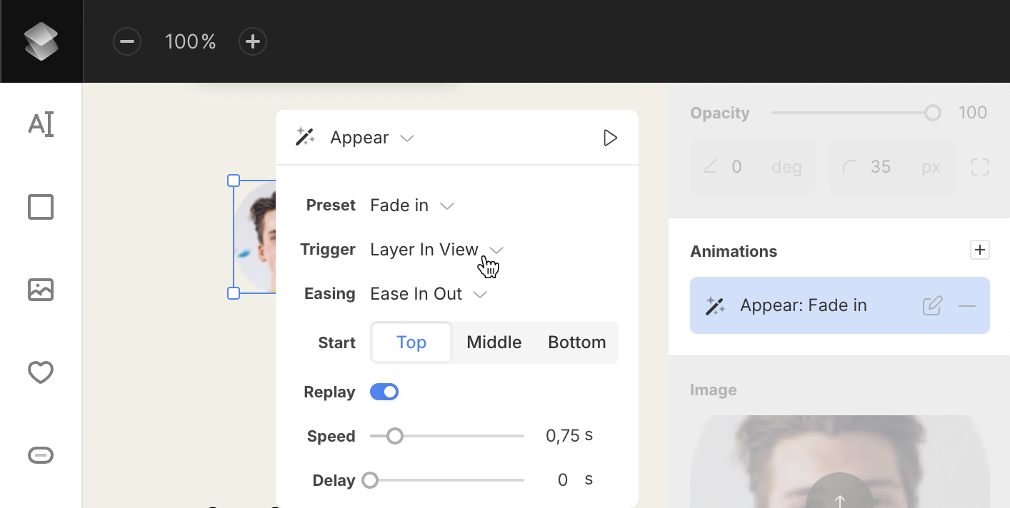 - Trigger (Appear animations only) – set when the animation should start: on appear, on scroll, or when the layer is in view.