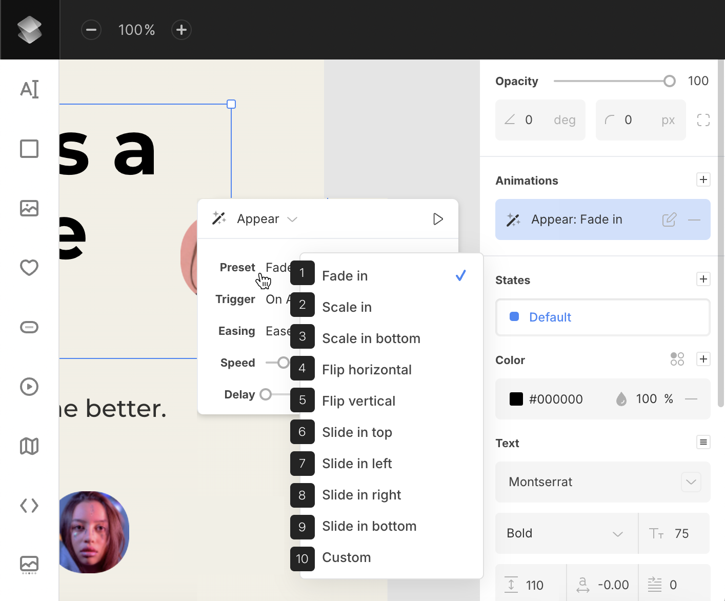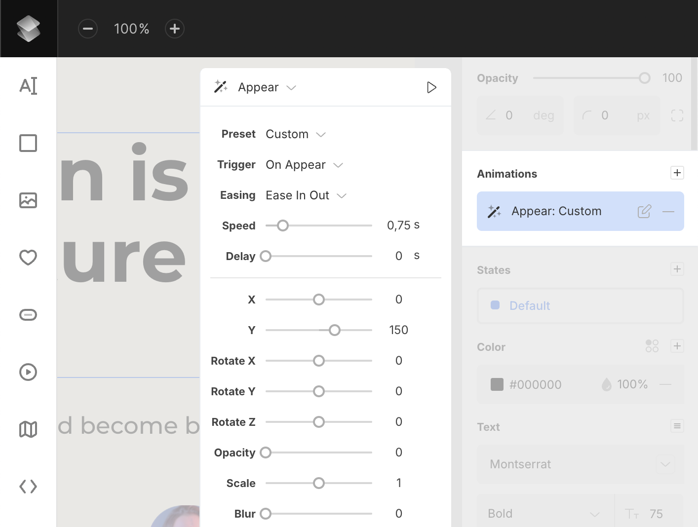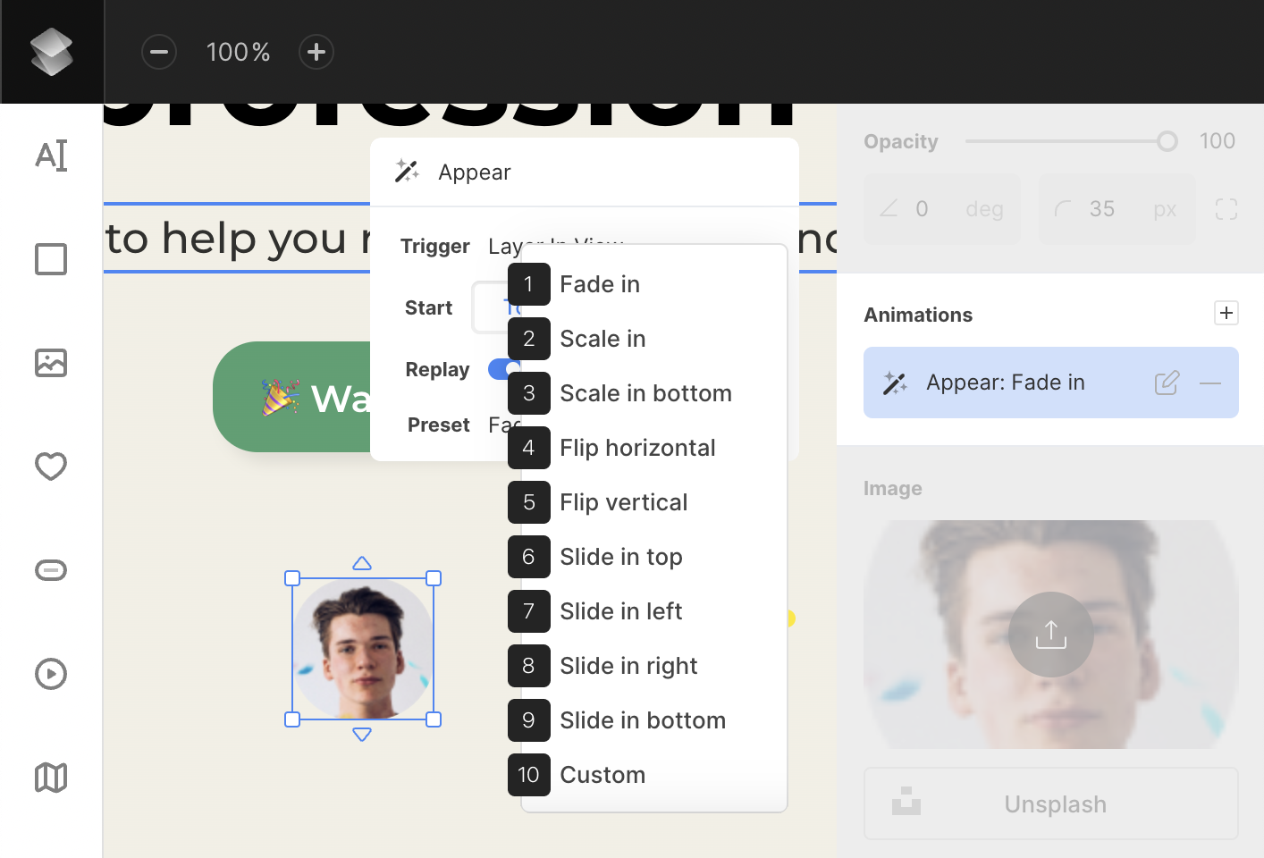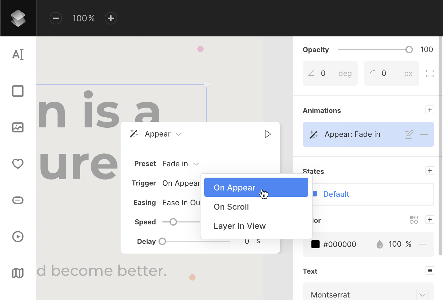 - Trigger (Appear animations only) – set when the animation should start: on appear, on scroll, or when the layer is in view.