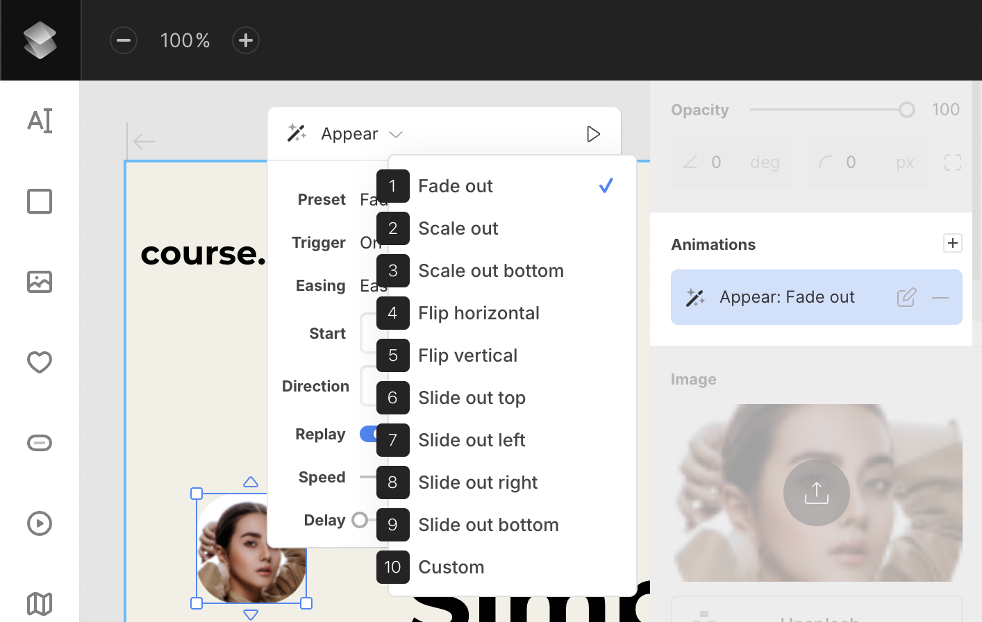 - Preset – choose from 9 predefined animation styles or create a custom option.