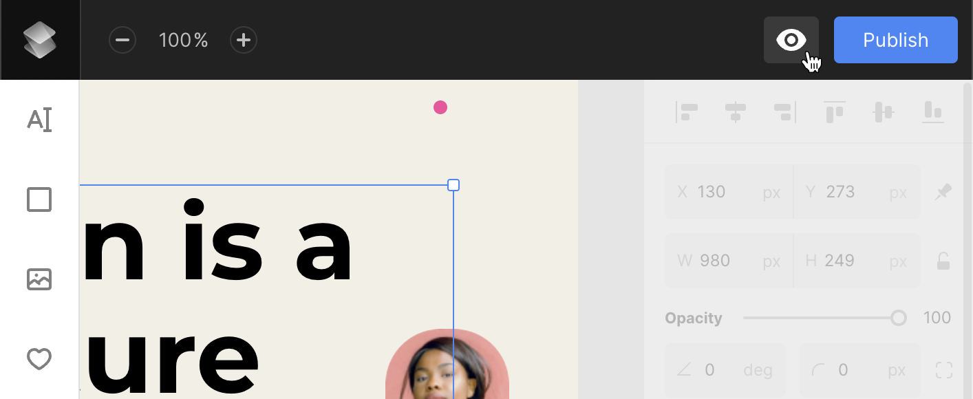 - Click the Preview (eye) icon in the top-right corner – this launches a live preview of the entire project, including all applied animations.